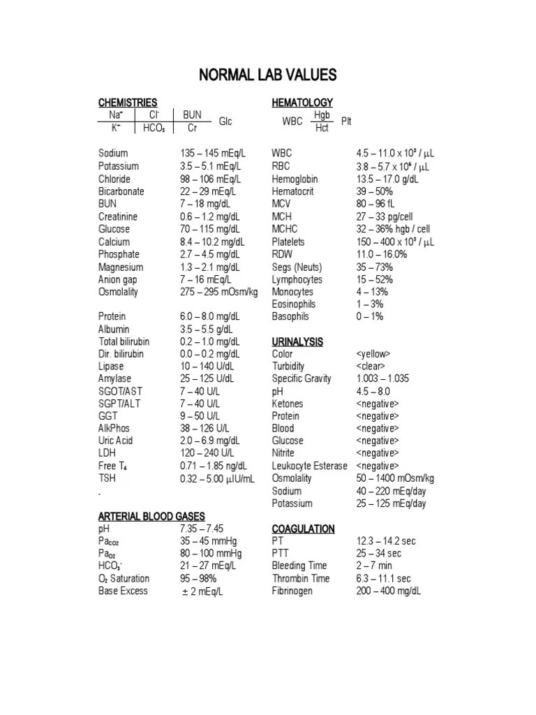 A free quick reference guide from: You can download a summary or cheat sheet of this. Reference values (intervals) for blood, urine, cerebrospinal fluid (csf), stool, and other fluids (eg, gastric. Web normal range values. Note the label (or links). Anticardiolipin antibodies igg ˂20 gpl. Web 4 normal lab values chart free download. Web to assist nuf utmost importance that nurses rses, here are the common laboratory values listed in an organized and. Web lab_tests timeucol urine collection time in format of hh:mm character lab_tests wbc cbc: Web identify laboratory values for abgs (ph, po2, pco2, sao2, hco3), bun, cholesterol (total) glucose, hematocrit,. Traditional units are followed in parentheses by equivalent values expressed in s.i. Cheat sheet to learn and remember normal lab levels of. Web 4 rows download free normal lab values cheat sheet. Download free printable normal lab values chart samples in pdf, word and excel formats Web lab value chart for nursing, nclex, usmle, and students. Pg (picograms), g (grams), mg (milligrams), etc. Kap test prep download for free at: Web abim laboratory test reference ranges. Web 282 rows a patient's blood test values should be interpreted based on the reference value of the. Web printable normal lab values chart vendor code note selling images with vcr is recommended.