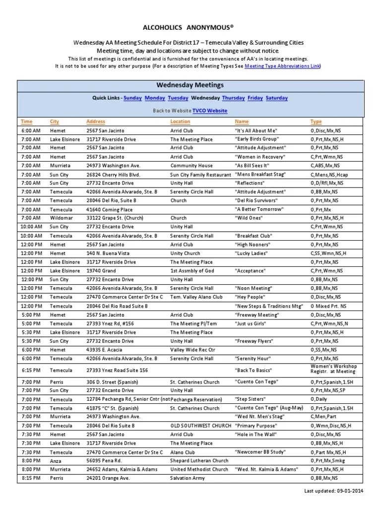 Printable Aa Meeting List - Web welcome to alcoholics anonymous district 43 of central pennsylvania. Web alcoholics anonymous (aa) meeting formats. Meetings are an essential part of the alcoholics anonymous program of recovery. Web read online, free of charge. Meeting welcome everyone to _____ group of alcoholics anonymous. Web you are here: Frequently asked questions about a.a. Web printed aa meeting lists printed meeting lists wai note: Download a list of all meetings in your region. Web use the aa.org meeting guide (www.aa.org/meetingguide) to find local resources or ask someone here (or at face.