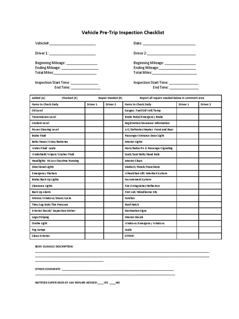 Sample Vehicle Pretrip Inspection Checklist Vehicles Private Transport